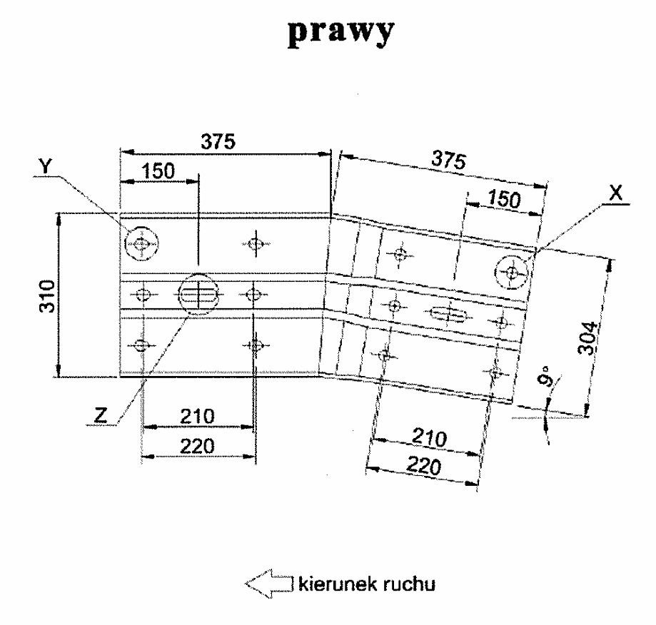 Łącznik 9° służy do połączenia poziomej prowadnicy bariery z jej skośnym zakończeniem, tworząc płynne zejście do gruntu na odcinku 4 metrów. Stosowany jest zgodnie z projektem, tam gdzie wymagane jest zakończenie ukośne bariery.